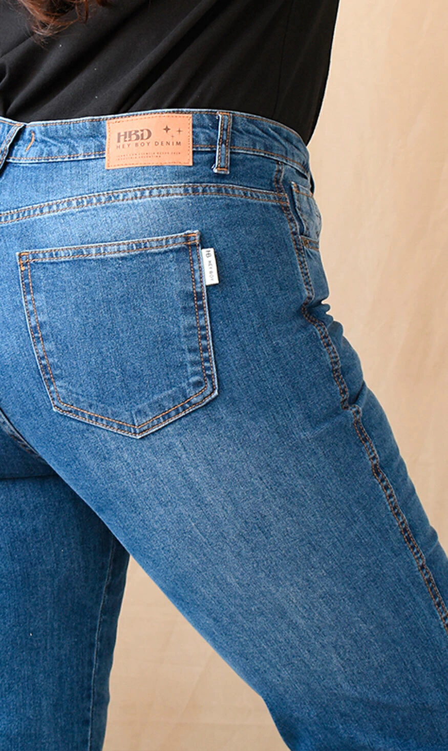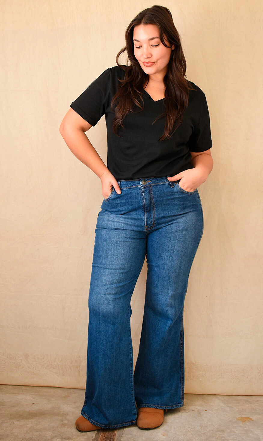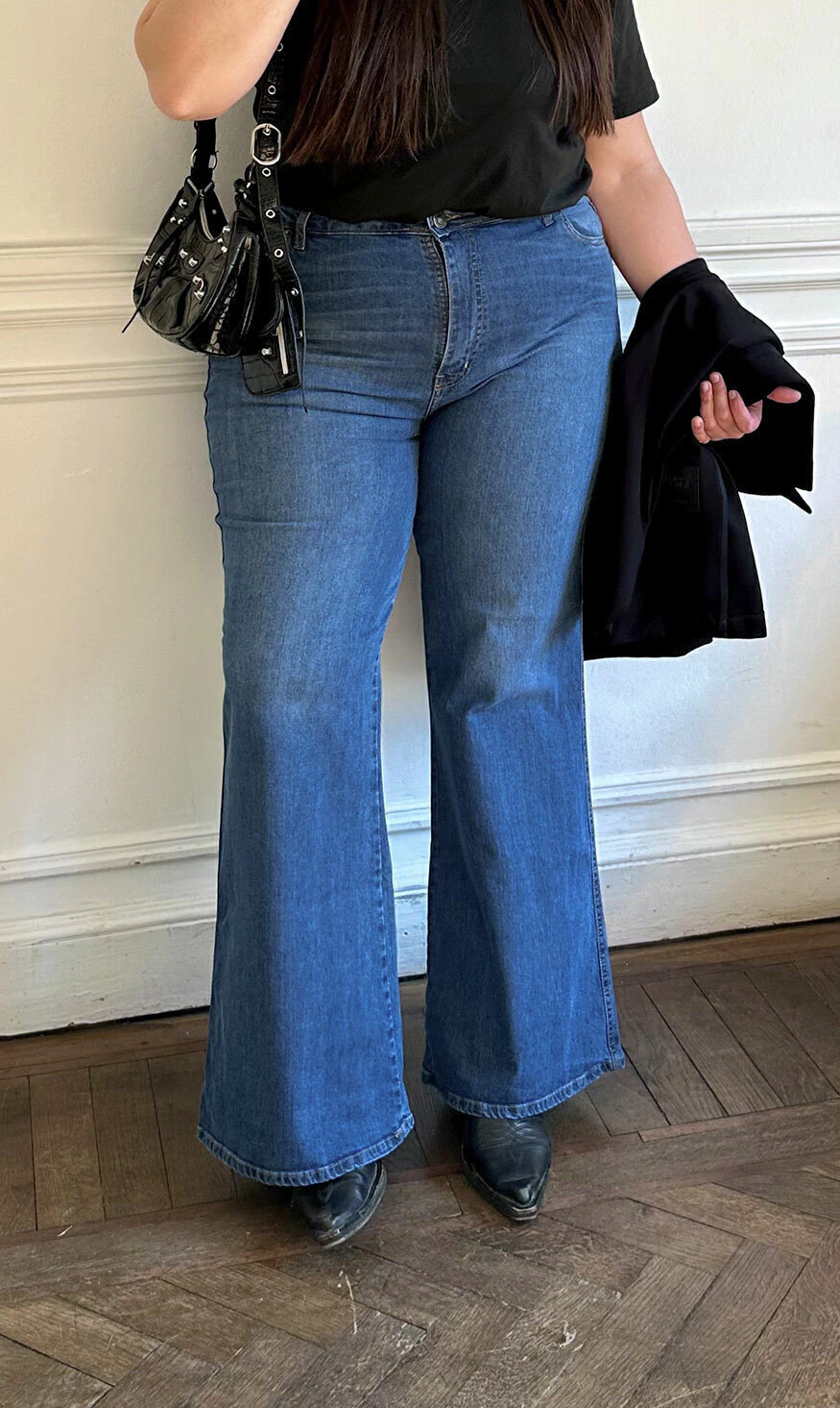 Jean flare estilo oxford con piernas acampanadas desde rodillas hacia la bota. Calce tiro alto, ruedo cerrado y con la elasticidad justa. La lona es la misma del straight Cordelia y helga, un semi elastizado que se adapta muy bien a todas.